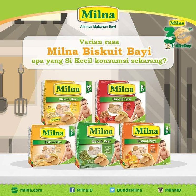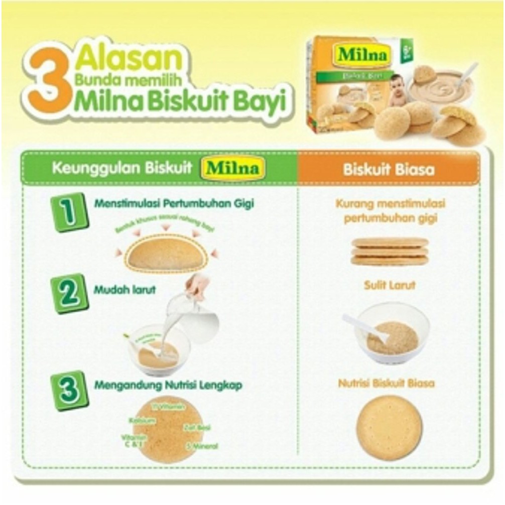 Rekomendasi biskuit untuk bayi 5 bulan ke atas. Jadi bayi nggak gampang tersedak. Milna berada di bawah naungan kalbe nutritionals yang telah berdiri sejak tahun 1982. Kandungan nutrisi dan gizi dalam produk milna utamanya zat mikronutrien (vitamin & mineral) sangat baik untuk tumbuh kembang si kecil. Salah satu variannya adalah milna biskuit rasa pisang yang bisa dikonsumsi oleh bayi berusia 6 bulan ke atas.